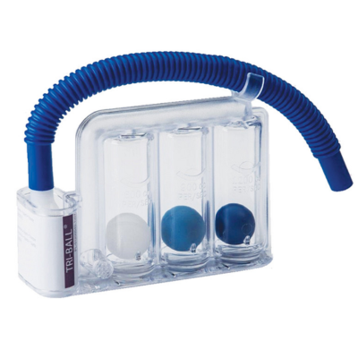 O Tri-Ball® é um incentivador respiratório composto por três câmaras transparentes com esferas coloridas. Ao inspirar lentamente através do bocal, o doente eleva as bolas, treinando a respiração de forma controlada e progressiva.