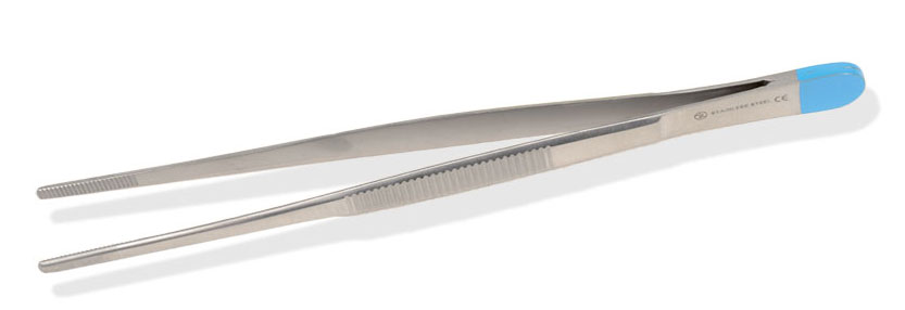 Pinça anatômica estéril descartável (esterilizada por radiação Gama), caracterizada por uma parte de cor azul para diferenciá-la dos instrumentos reutilizáveis.