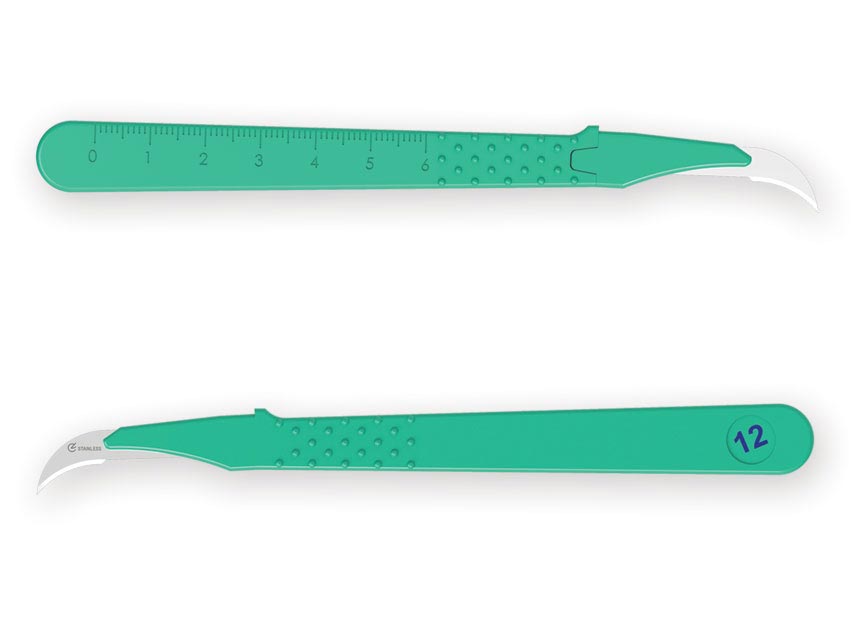Bisturis descartáveis estéreis n. 12 com protector da lâmina. Lâmina em aço inoxidável soldada num cabo em ABS, ligeiro e ergonômico. Asseguram uma ótima afiação e um perfeito controle durante o corte.