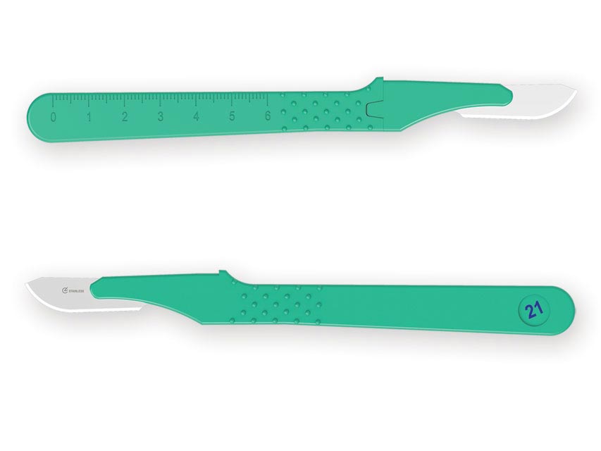 Bisturis descartáveis estéreis n. 21 com protector da lâmina. Lâmina em aço inoxidável soldada num cabo em ABS, ligeiro e ergonômico. Asseguram uma ótima afiação e um perfeito controle durante o corte.