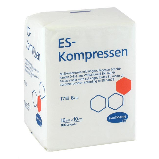Kompressen ES é uma compressa de algodão absorvente não estéril, com gramagem 17, bordas cortadas e dobradas para o interior, e isenta de látex.
