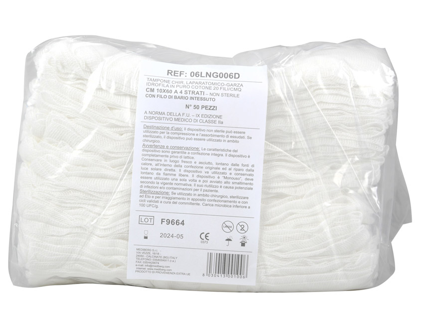 Gaze de laparotomia 100% algodão composta por 4 camadas de 20 fios por cm quadrado, com bainha nas bordas e altamente absorvente.