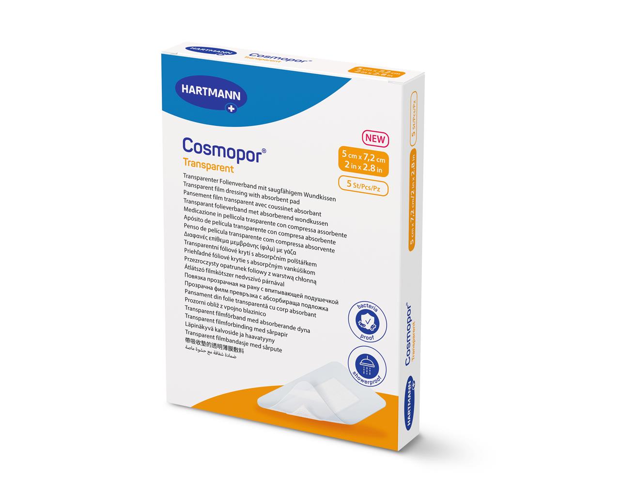 Cosmopor® Transparente é um medicamento em película transparente, autoadesiva, composta por uma película de poliuretano semipermeável, impermeável e transparente, revestida por um adesivo em poliacrilato e dotada de um tampão absorvente para a ferida.