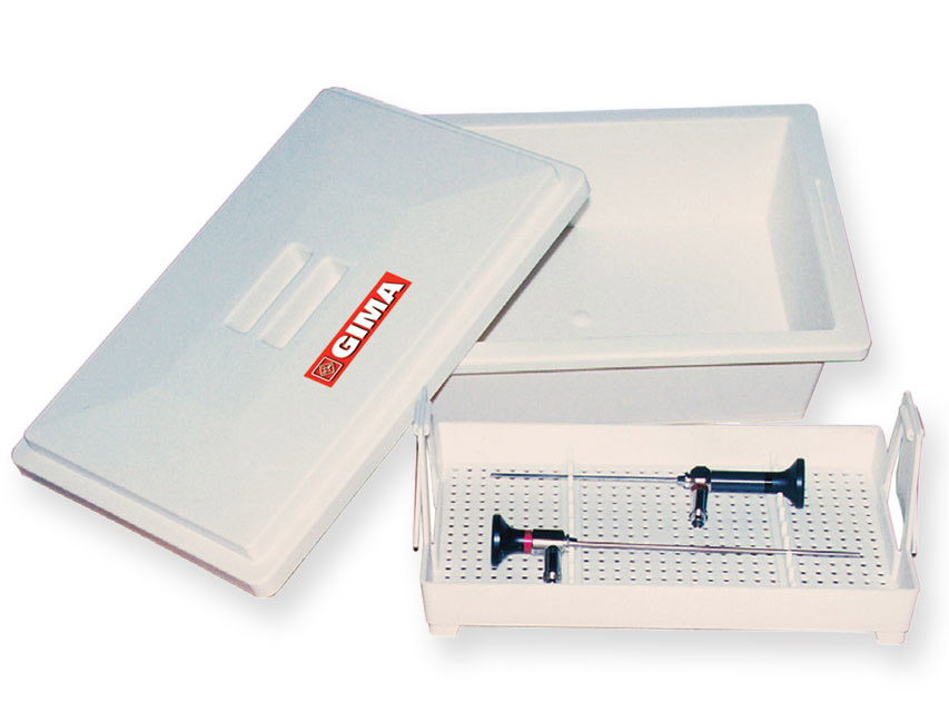 Principais vantagens Compacta e prática, a caixa permite o tratamento de instrumentos em espaços reduzidos. O suporte interno perfurado mantém os instrumentos elevados do fundo, favorecendo a exposição uniforme ao produto desinfetante e a drenagem. Fabricada em Itália, foi concebida para uso repetido e para utilização com soluções de esterilização a frio.