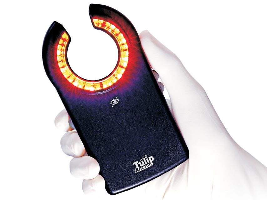 O dispositivo VeinSpy™ é constituído por duas series de LED coloridos: uma serie emite luz laranja otimizando a visualização das veias superficiais, e a outra serie emite uma luz vermelha adequando-se as veias mais profundas.