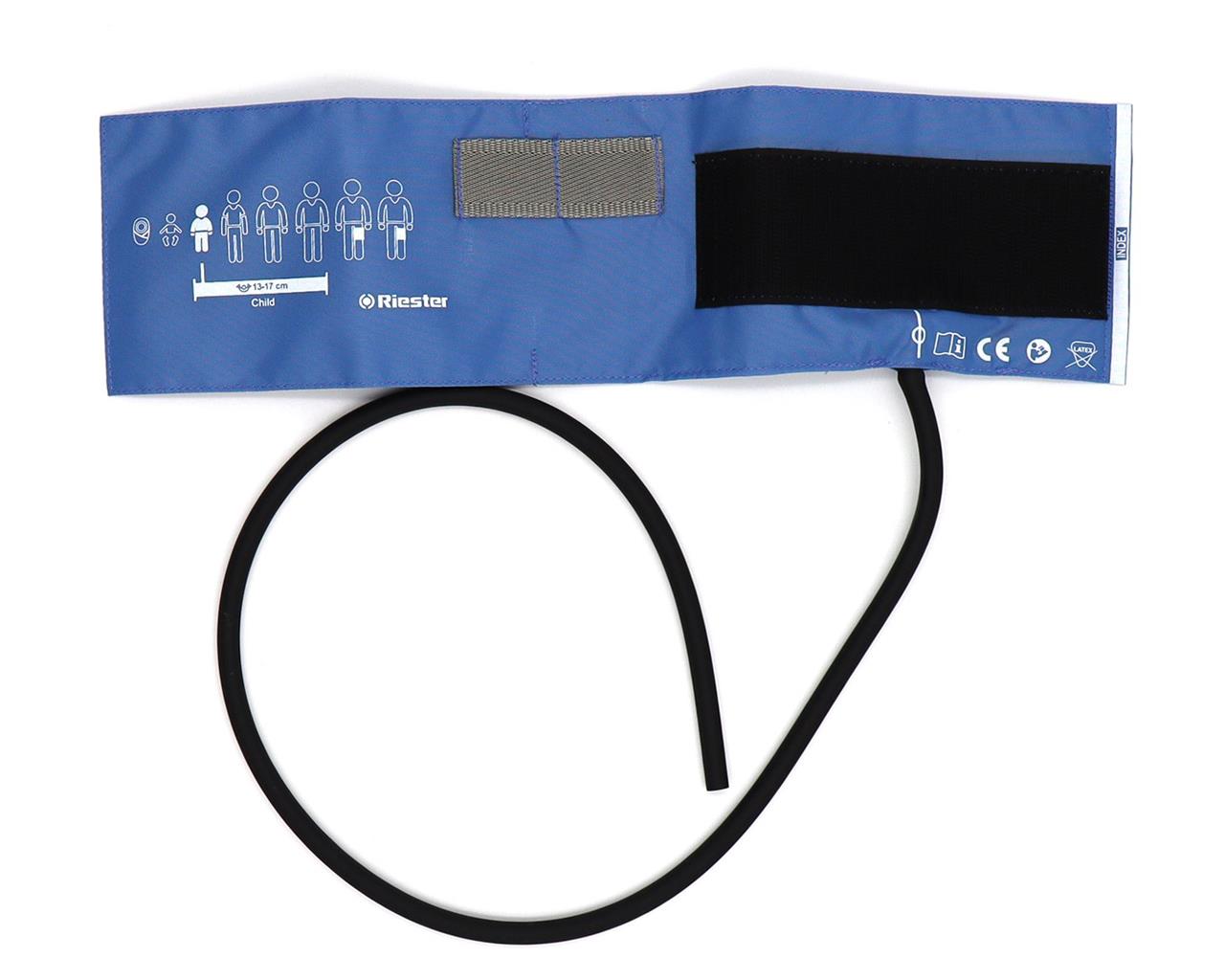 Braçadeira Riester de 1 tubo para medição da tensão arterial em crianças. Braçadeira com fecho de velcro e cor azul clara.