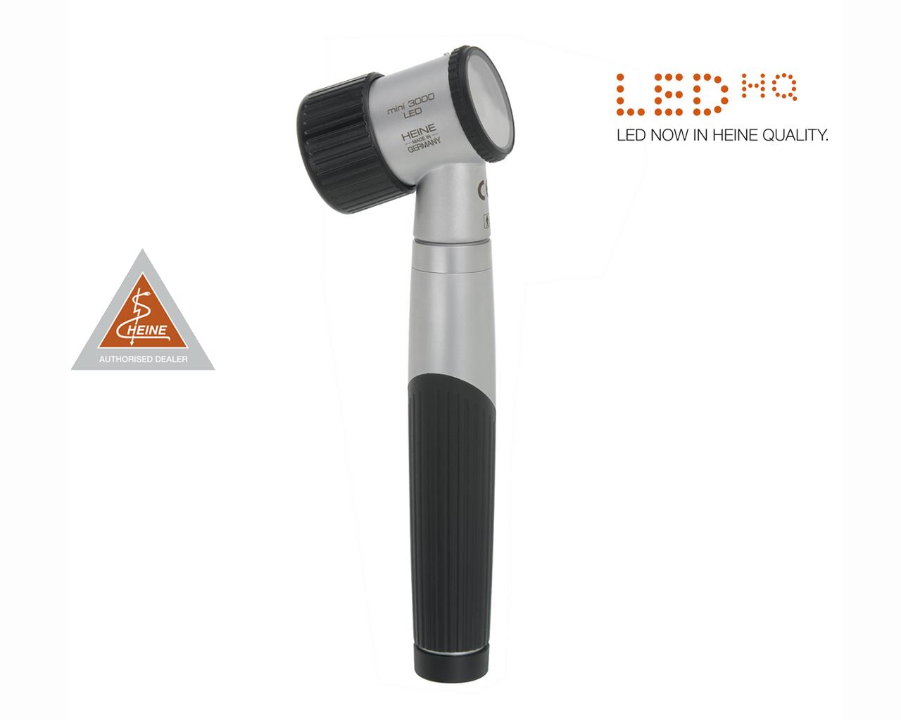 Dermatoscópio HEINE mini 3000®; dermatoscópio de bolso moderno em design compacto com ótica de qualidade. Ampliação de 10x com ajuste de focagem. Fixação de parafuso em metal. Apenas compatível com as pegas do mini 3000.