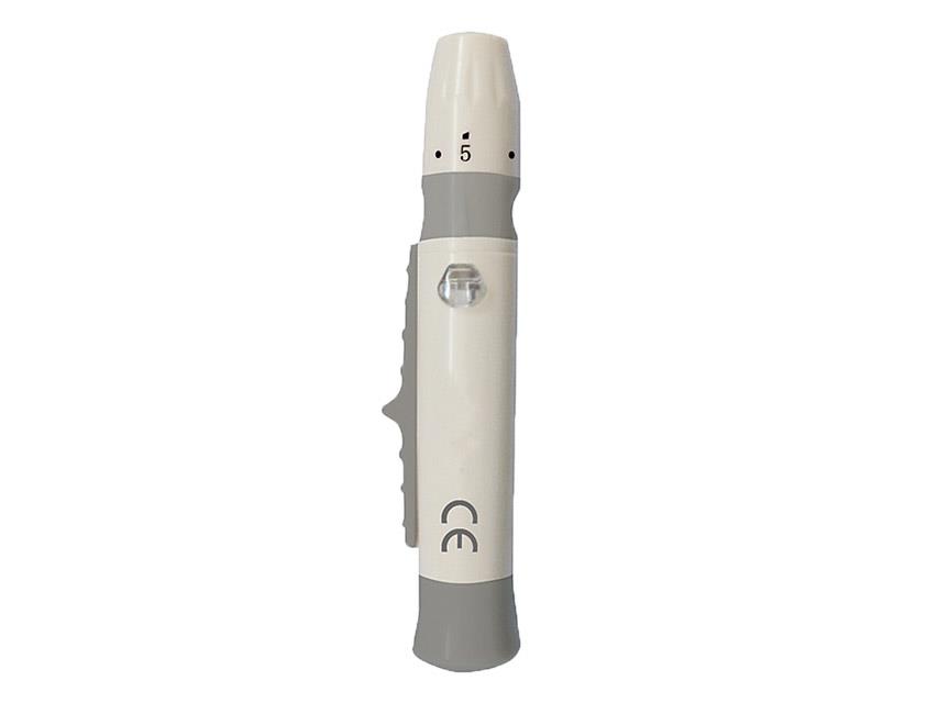 Dispositivo de punção reutilizável, em plástico extremamente resistente. Graças à ponta regulável é possível escolher a profundidade de penetração das lancetas.