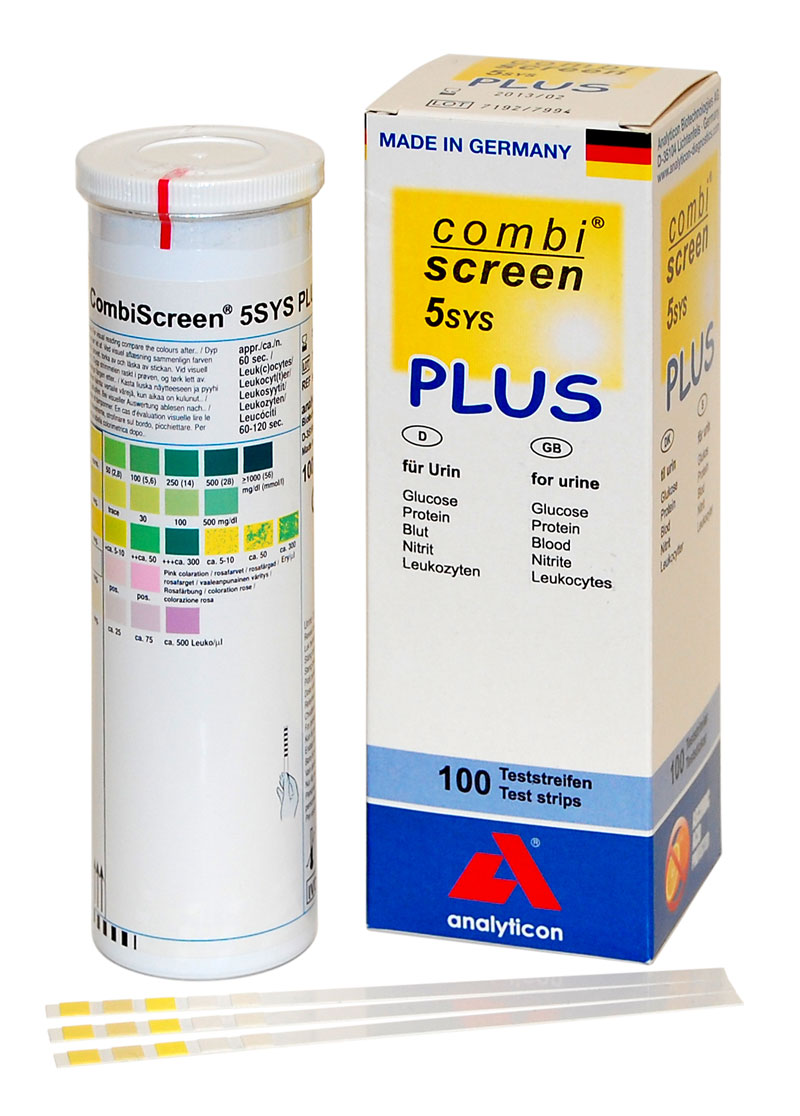 Tiras ANALYTICON para urina COMBI SCREEN SYS PLUS que permitem a avaliação de 5 parâmetros.