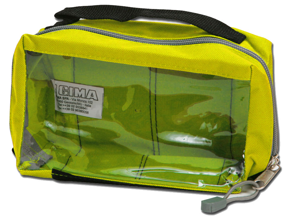 A bolsa E1 é um estojo retangular para kits de primeiros socorros e acessórios médicos, caracterizada por uma janela transparente, que facilita a visualização do conteúdo, e por uma larga faixa de velcro fêmea na parte de trás para fixação em suportes ou dentro de bolsas/mochilas.