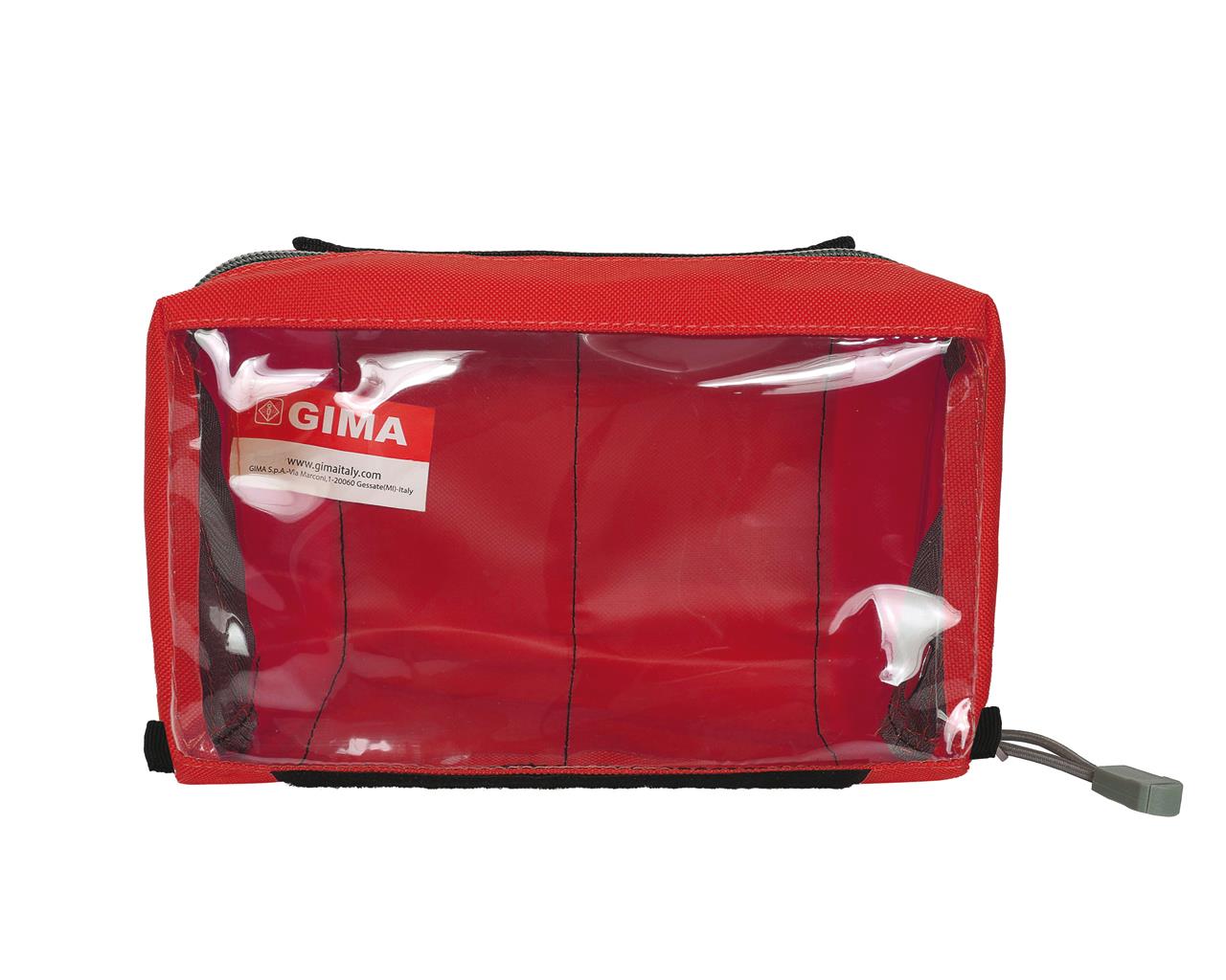 A bolsa E1 é um estojo retangular para kits de primeiros socorros e acessórios médicos, caracterizada por uma janela transparente, que facilita a visualização do conteúdo, e por uma larga faixa de velcro fêmea na parte de trás para fixação em suportes ou dentro de bolsas/mochilas.