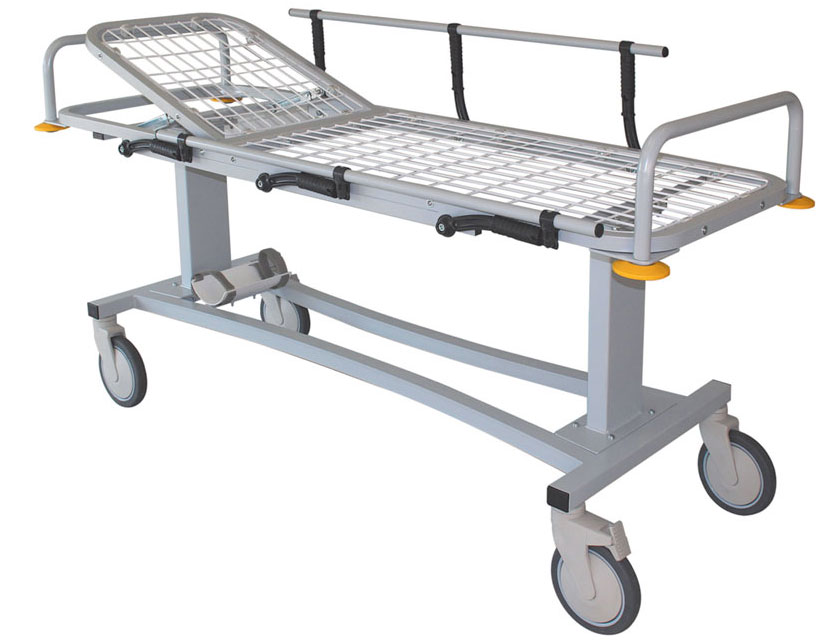Equipada com 4 rodas com um diâmetro de 200 mm, 2 das quais com travões, pegas e ângulos de para-choques, calhas laterais e suporte de cilindros.