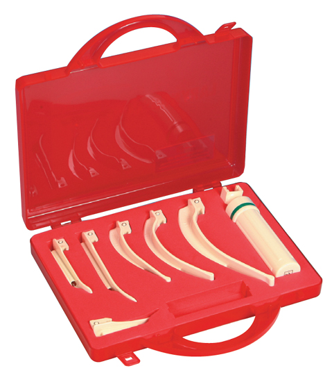 Conjunto prático composto por um cabo de plástico para adultos e seis lâminas descartáveis, modelos Miller 0,1,2 e Mc-Intosh n.º 2, 3 e 4, tudo num prático estojo de emergência.