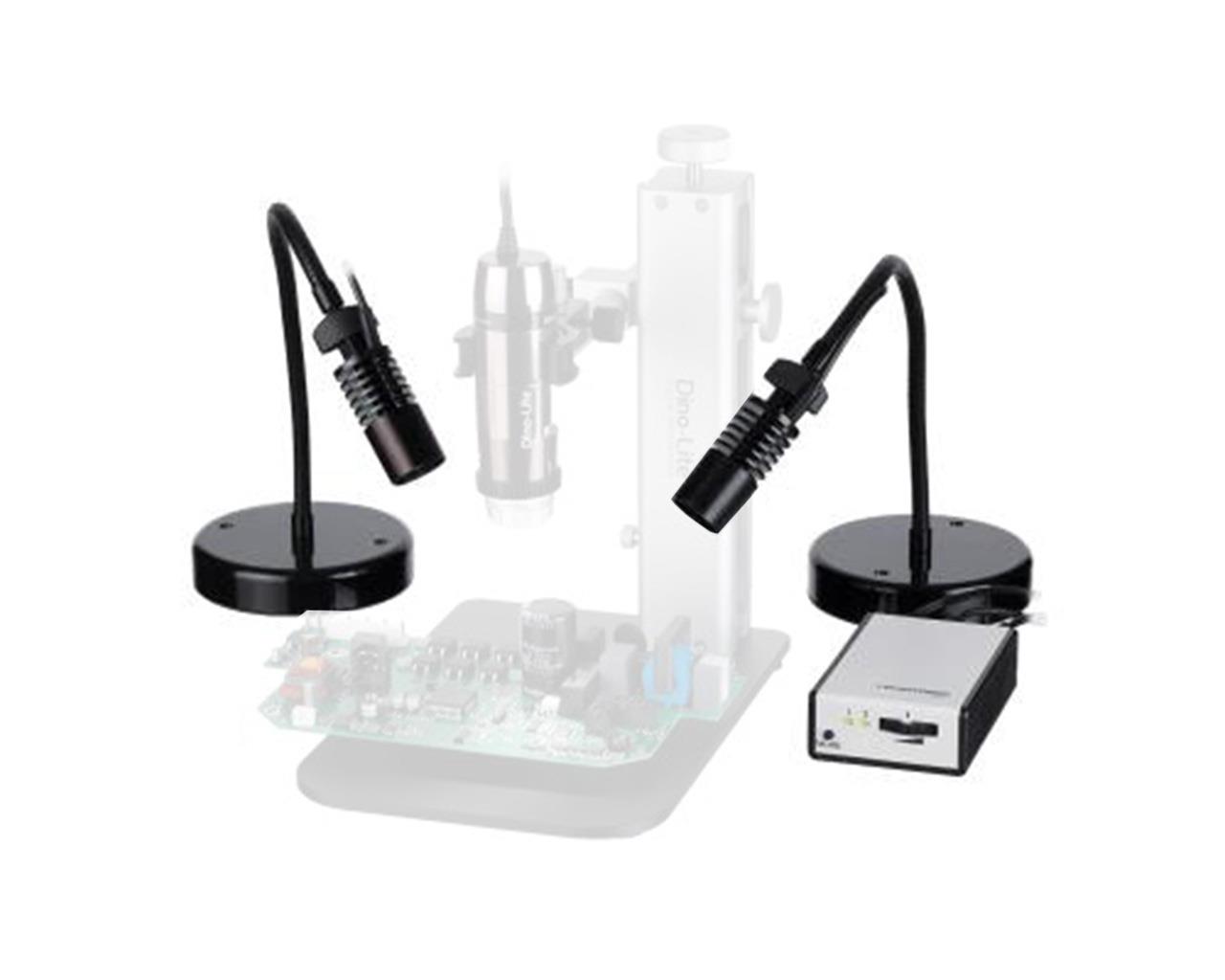 Com este conjunto é possível criar dois pontos de luz de alta potência individuais com braços flexíveis. Por estar montado sobre a base, pode ser posicionado em qualquer lugar ao redor da amostra, oferecendo máxima flexibilidade.