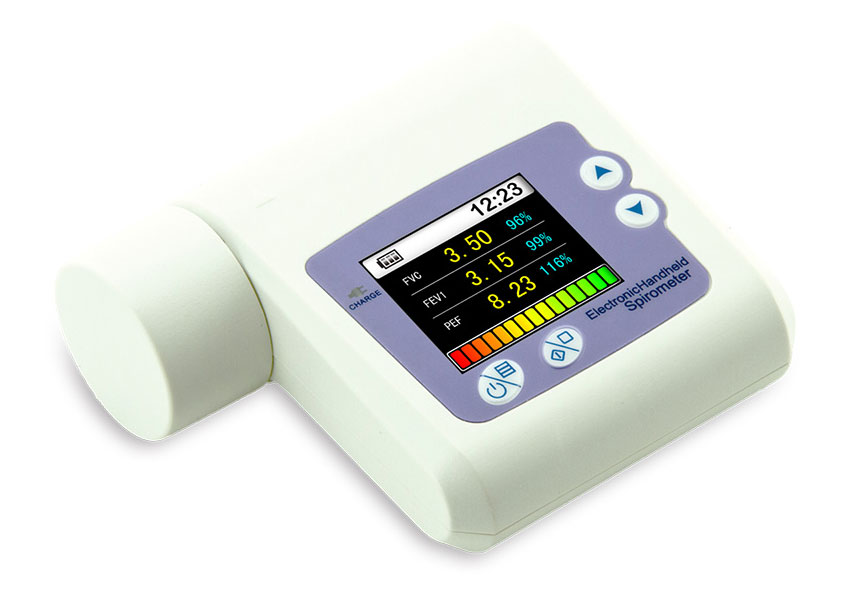 O modelo SP10 é um espirômetro leve (apenas 150 g) e portátil (97 × 89 × 36 mm), projetado para uso doméstico e clínico. O espirômetro SP10 está equipado com display LCD colorido de 1,8'' e Bluetooth para conexão a um PC mesmo sem cabo USB.