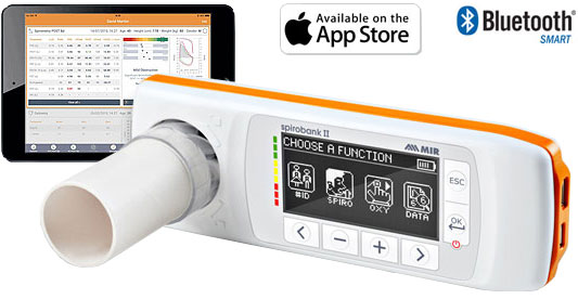 • App MIR Spiro® per iOS o Android, permite efectuar testes de espirometría em tempo real diretamente no tablet ou smartphone com eventuais atualizações gratuitas online. As espirometrias efectuadas em modalidade mobile podem ser podem ser arquivadas manualmente em PDF no Cloud e não são integradas no software MIR Spiro® configurado no PC.
