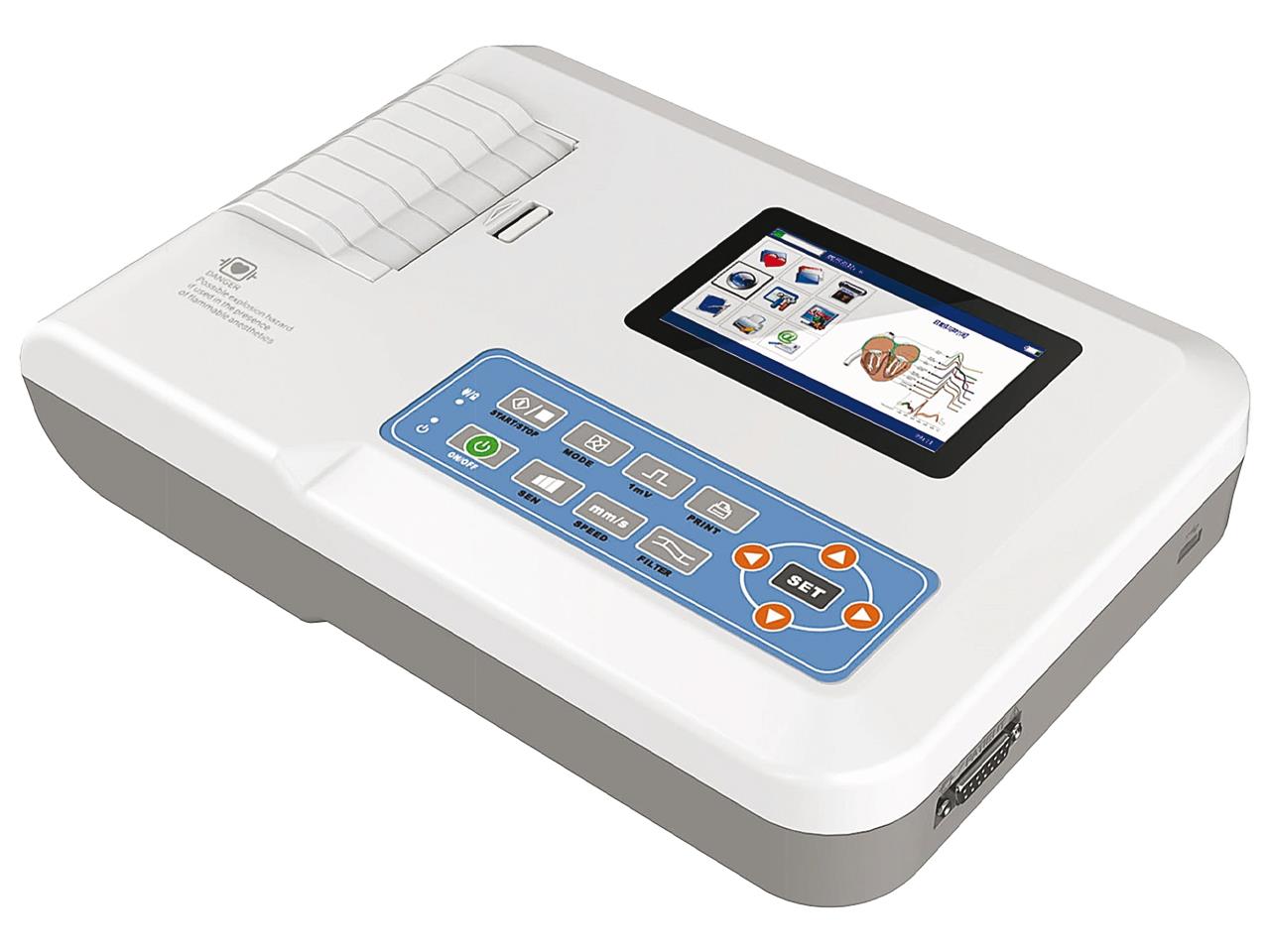 O ECG 300G-VET registra e exibe traçados de ECG em modo automático ou manual, medindo e analisando parâmetros automaticamente. Ele pode receber simultaneamente sinais de 12 derivações e imprimir o traço relativo.