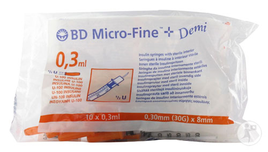 Seringa insulina Micro-Fine™+ de 0,3 ml com agulha 30 G × 8 mm e termosoldado.
