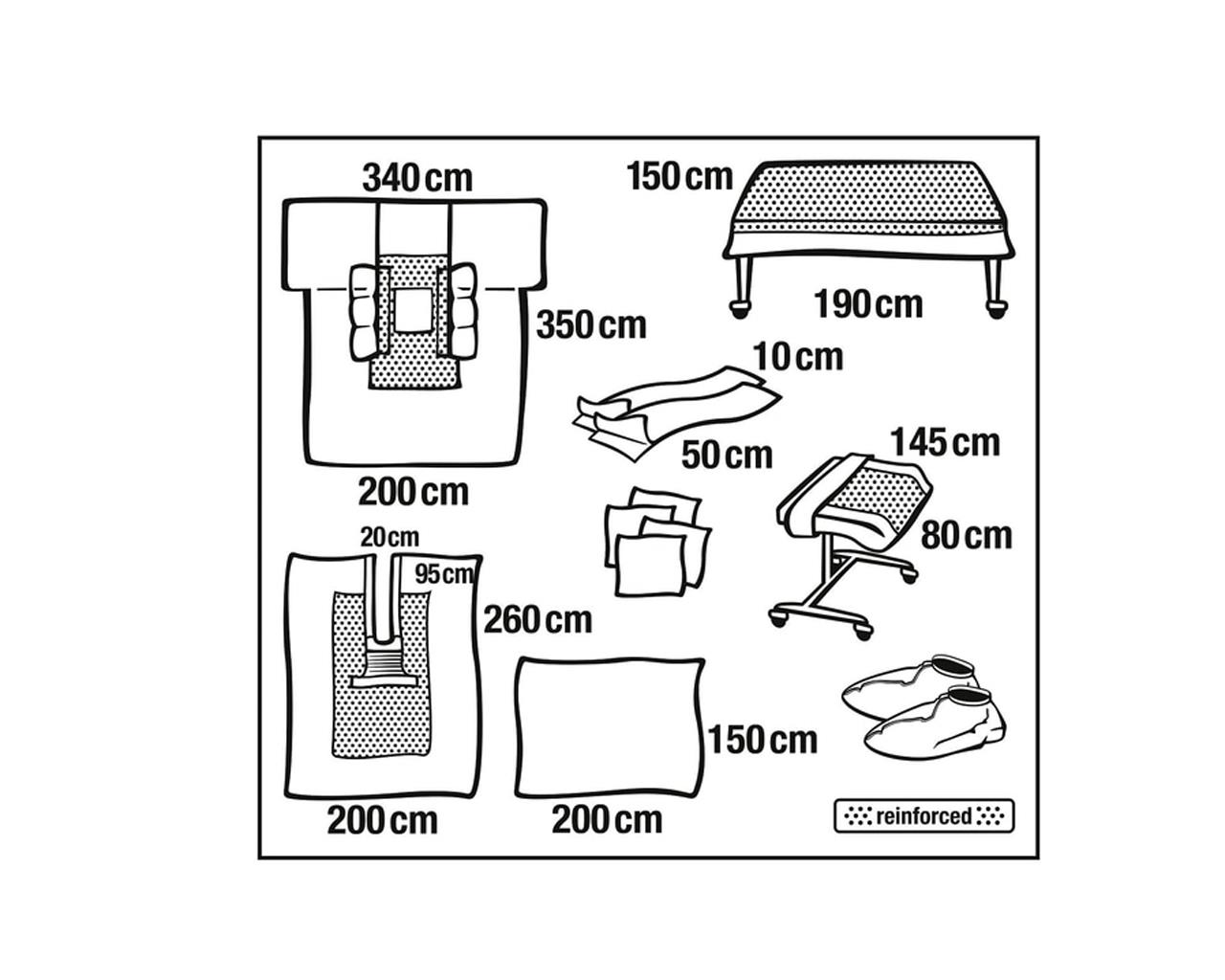 O conjunto integra lençóis e acessórios projetados para otimizar a segurança do paciente e a praticidade na sala de operações: um grande lençol torácico com janela coberta por filme de incisão integrado, bolsas laterais para aspiração, bolsos para instrumentos e laços para passagem e fixação de tubos e cabos. Inclui também um lençol adesivo dividido com cobertura perineal para cobrir ambas as pernas e muitos dispositivos descartáveis para a montagem completa do campo.