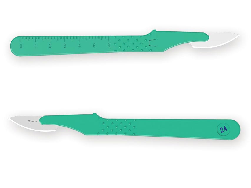 Bisturis descartáveis estéreis n. 24 com protector da lâmina. Lâmina em aço inoxidável soldada num cabo em ABS, ligeiro e ergonômico. Asseguram uma ótima afiação e um perfeito controle durante o corte.