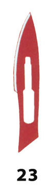 Lâminas bisturi descartáveis estéreis n° 23 em fibra de carbono. Lâminas em fibra de carbono fabricado de acordo com os requisitos BRITISH STANDARDS BS 2982, 5194 ed ISO 7740. Cada lâmina é embalada individualmente em folhas de alumínio e em caixa de 100 peças.