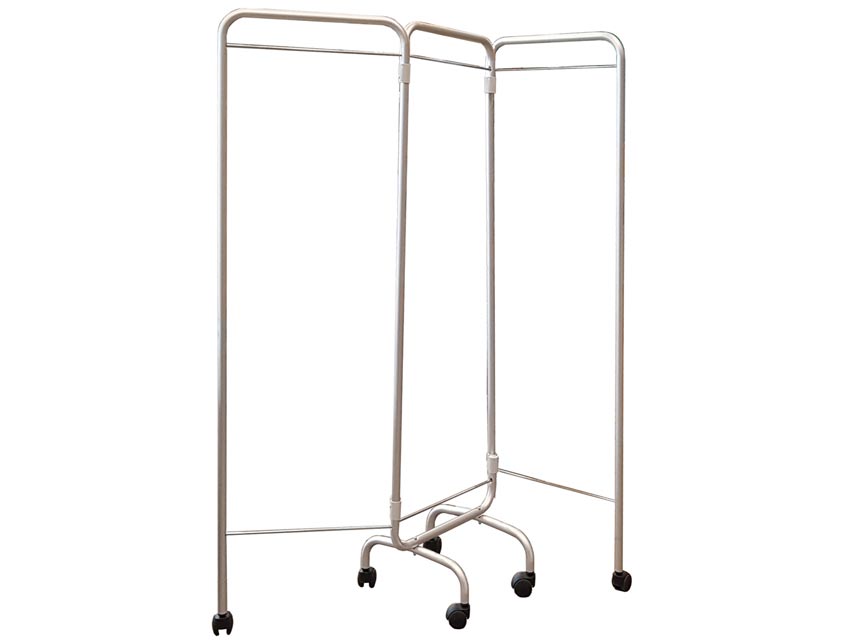 Biombo de 3 secções com rodas com estrutura tubular de alumínio de 50 mm de diâmetro. Fornecido sem cortina.