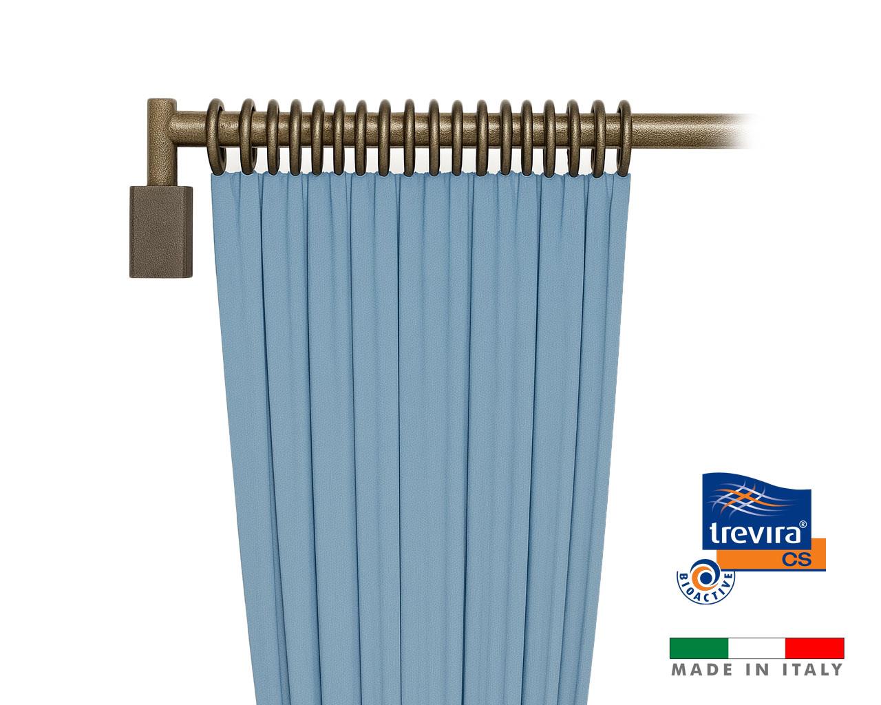 A Tenda, em Trevira, está equipada com argolas que permitem um fácil deslizamento, é fabricada em material ignífugo (Classe I), antialérgico, antibacteriano, impermeável e altamente resistente à abrasão.