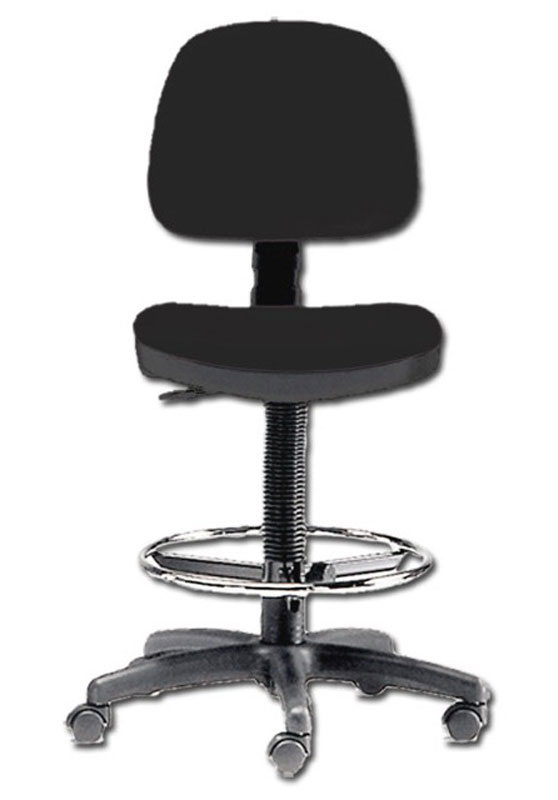 Banco com assento e encosto estofado em material ignífugo a imitação de pele. Altura ajustável. Base plástica com 5 rodas e aro cromado.