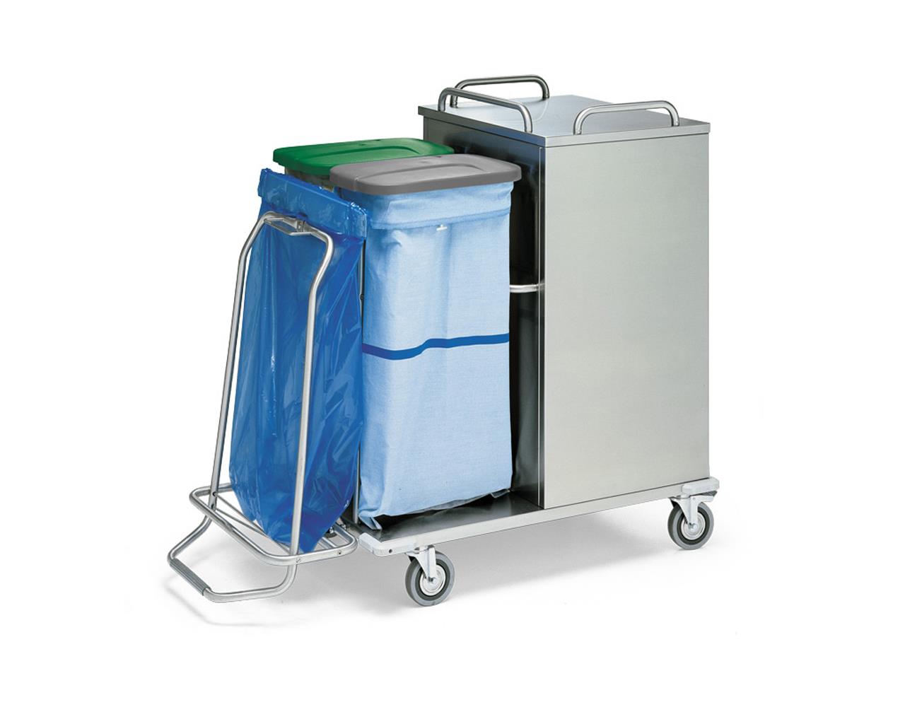 O design fechado permite a separação das roupas limpas das sujas, melhorando a higiene durante o transporte interno. O carrinho é manobrável graças a 4 rodas giratórias anti-marca, sendo 2 com freio, e é compatível com sacos de lixo de 70 litros.