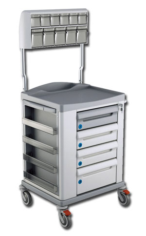 Tampo em plástico lavável e desinfetável com uma grande superfície de trabalho com compartimento de arrumação e rebordo de contenção perimetral. No tampo, nos dois cantos traseiros, existem duas hastes de acessórios às quais se fixam dois módulos de gavetas com 10 gavetas rebatíveis cada. No lado direito, existe uma pega de empurrar em forma de punho ergonómico para um controlo seguro do carrinho e um compartimento rebaixado com um recipiente para resíduos de 15 litros de abertura manual e um suporte para cateteres.