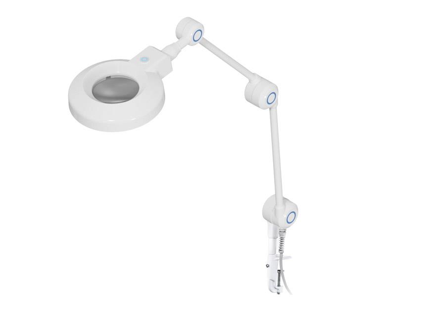 Lâmpada de mesa com lupa bi-convexa com luz fluorescente fria, ideal para dermatologia, amplamente ajustável graças a um prático braço articulado.