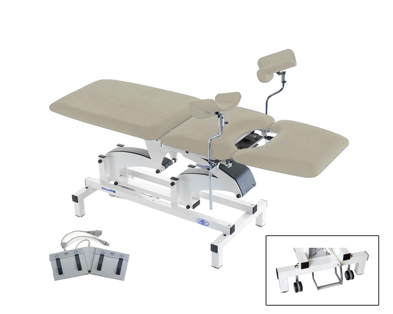 Marquesa polivalente com dois motores, adequada em ginecologia e urologia para diagnóstico e tratamento. Regulação eléctrica em altura através da placa de pés.