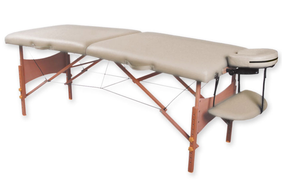 Marquesa para massagem dobrável de madeira com 2 secções e altura regulável. Moldura em faia da Alemanha e capa em vinil PVC com forro de 5cm de espessura.