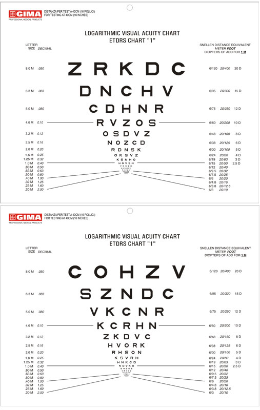 Escala Optométrica frente e verso para consulta da acuidade visual de perto.