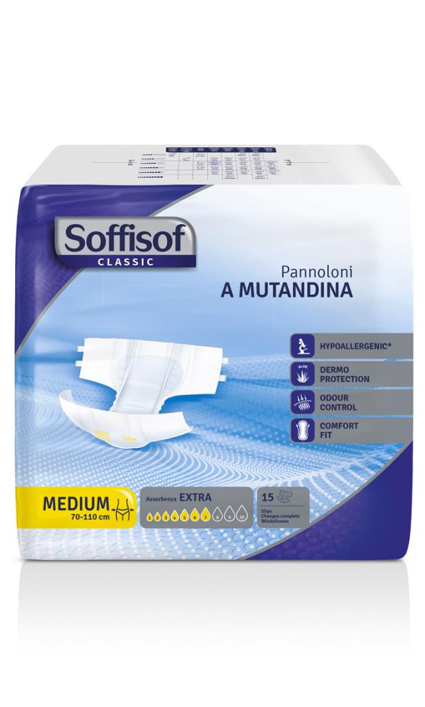 As Fraldas Soffisof Classic EXTRA são indicadas para incontinência urinária e/ou fecal moderada a grave e garantem a máxima segurança e conforto tanto para utilizadores autónomos como para utilizadores acamados. A almofada absorvente, de formato anatômico, é composta por penugem de celulose virgem de fibra longa certificada PEFC concentrada principalmente na parte central. As grandes dimensões dianteiras e traseiras e a presença de polímeros gelatinizantes especiais (SAP) com funções superabsorventes e de eliminação de odores garantem a máxima eficácia em todas as situações. A folha de filtro em tecido não tecido macio em contato com a pele é testada dermatologicamente e embebida em Aloe para maior proteção da pele. A camada externa impermeável é feita de polietileno macio para garantir a máxima segurança e conforto. Também na parte externa existe um prático indicador de alteração que permite verificar o grau de saturação da proteção. A fixação da proteção é assegurada por 4 adesivos tipo “Velcro” reposicionáveis.