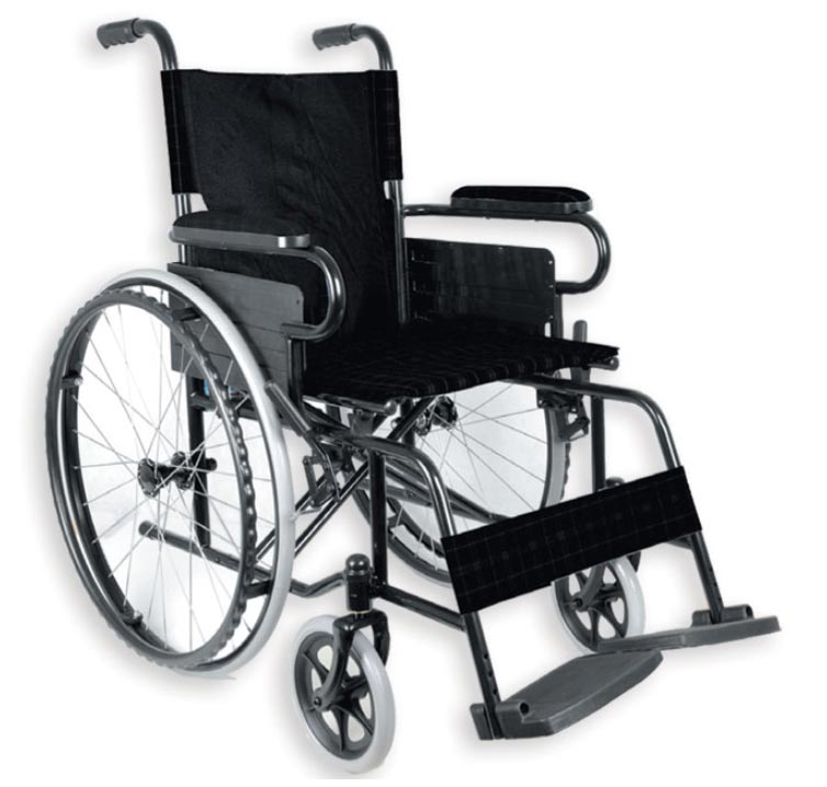 Cadeira de rodas em tecido nylon preto com rodas sólidas.