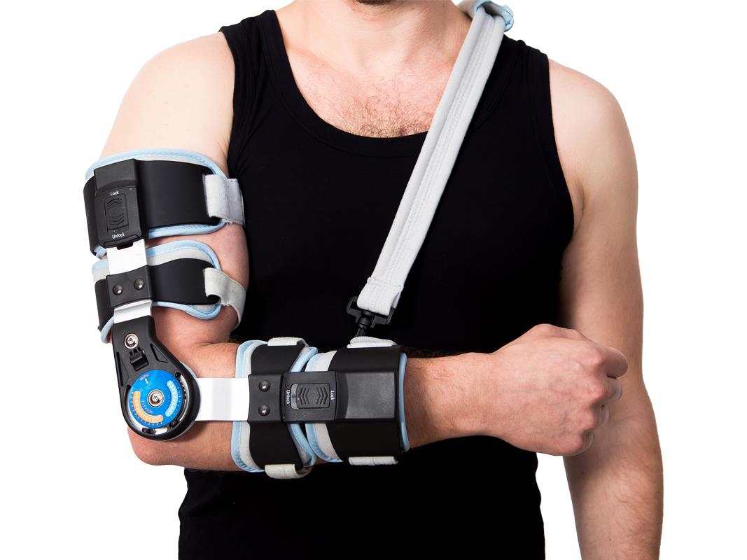 Cinta para imobilização pós-operatória do cotovelo, limitando a amplitude de movimento (ADM) através de articulações ajustáveis em incrementos de 15°. Ideal para o tratamento conservador da luxação ou deslocamento do cotovelo e para fracturas do úmero distal, radial ou ulnar proximal, estáveis ou fixadas internamente.