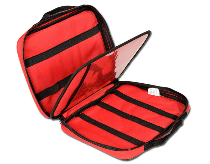 Maxi estojo para ampolas em nylon vermelho. O recipiente é ideal para proteger e identificar-se para 46 frascos de diferentes tamanhos. Dividida em dois compartimentos, é fornecido com tiras elásticas para a realização de tubos de ensaio é grande (9), que são pequenos (37). Partição com bolso transparente para documentos.