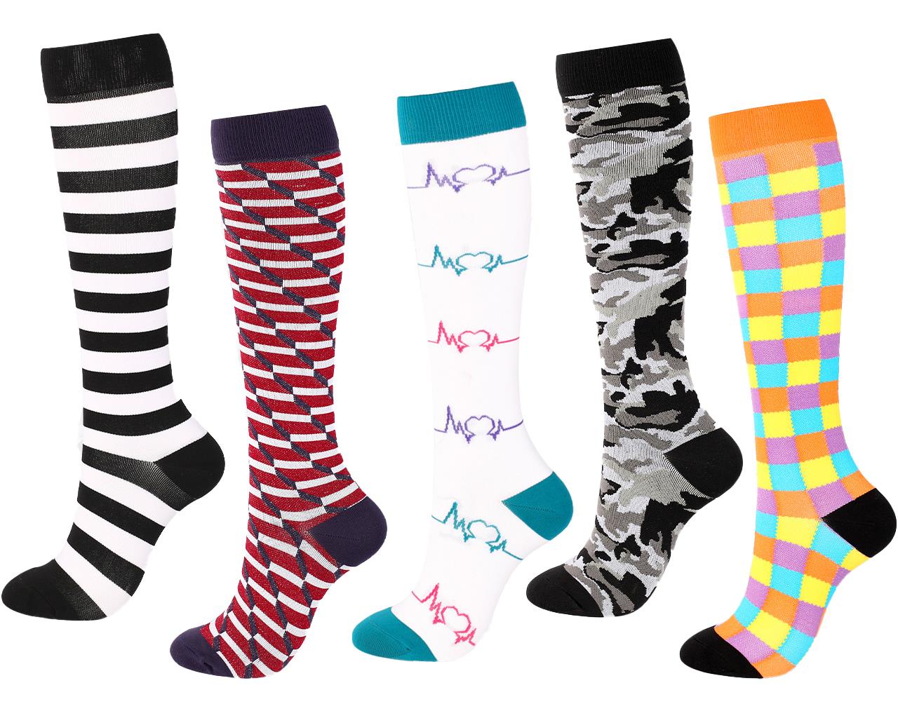 Meias coloridas até ao joelho com compressão graduada para melhorar a circulação sanguínea.